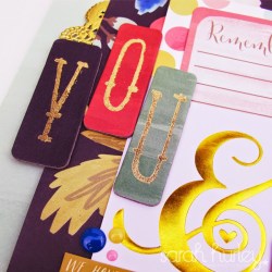 I’ve layered up a few papers, I wanted to use all of them really but I restrained myself and kept the layers quite big so as not to cover up the beautiful detailing, the die cut ephemera worked well with taps and labels to give more dimension and those all important gold accents! I finished with the big bow (a must have – I love that it looks dimensional but it’s actually flat to tuck into an album!) and a sprinkling of enamel dots. My only addition was a gold doily (it’s an obsession, really… put the doilies down, walk away… lol)